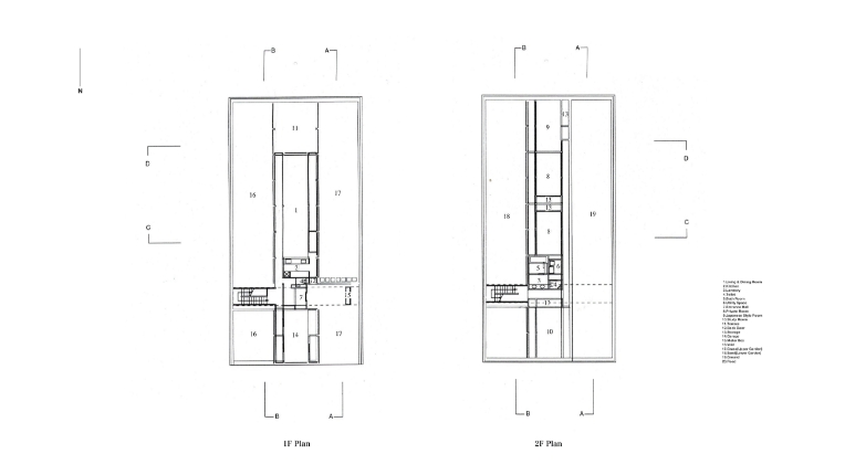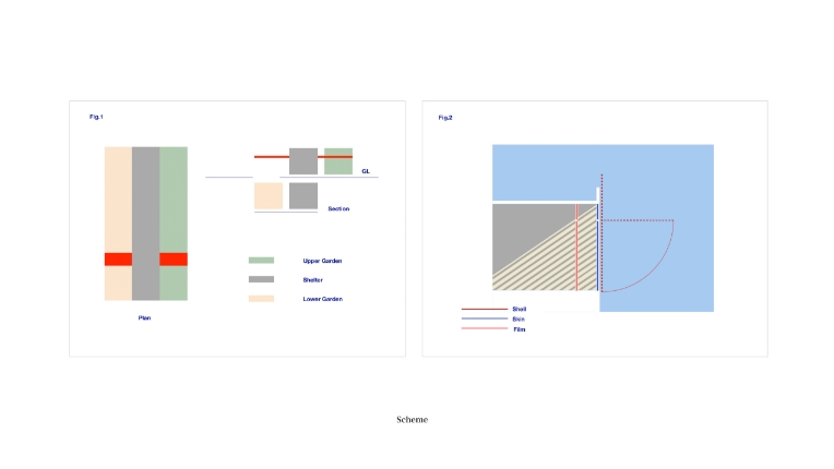 隣地に接するゾーンを庭とし、2つの庭の間のゾーンを居住部分とする。このゾーニングは、やや細長いプロポーションを持つこの敷地において先述の3つの主旨を最も効果的に具現するものとして選択された。