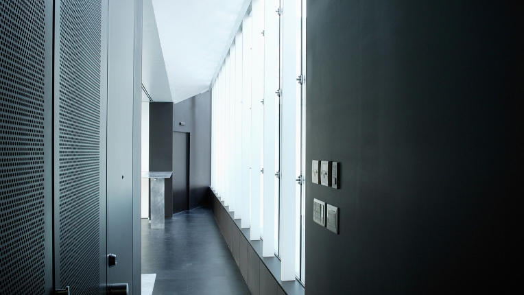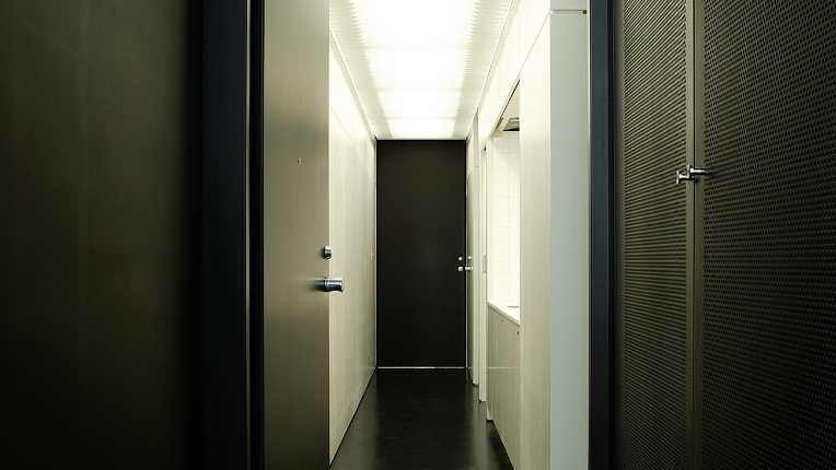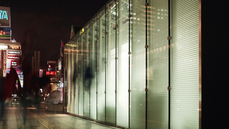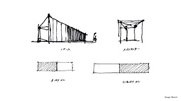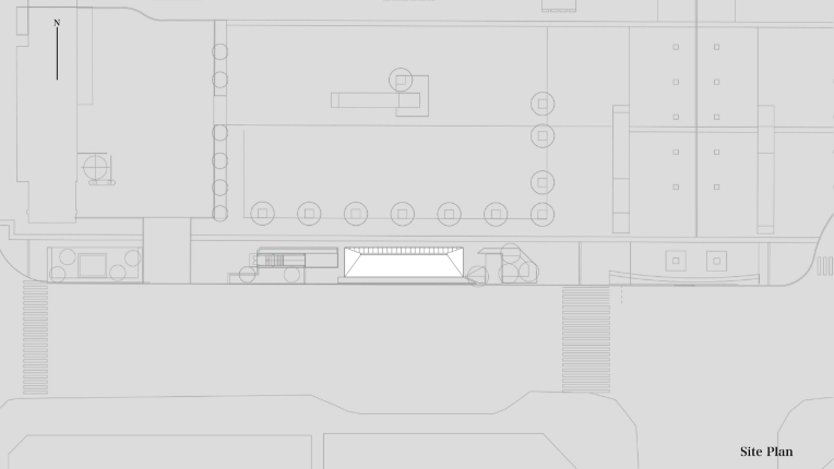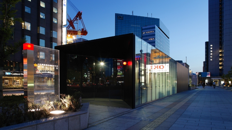 The building is one-storied in order to reduce the load to the existing, artificial ground of the plaza. The box has two zones: the public zone consists of a community room and an office near the entrance while the private zone consists of an investigation room, a hot water supply room, a napping room and a storage. Glass was adopted in the public zone exterior and a steel board for the private zone exterior.